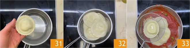 Cozinhe os raviolis em água salgada por cerca de 5 minutos 31, tendo o cuidado de virá-los delicadamente durante o cozimento, depois escorra-os 32 e transfira-os diretamente para a frigideira com o molho 33.