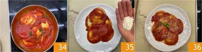 Deixe-os apurar por mais um minuto, depois adicione mais algumas folhas de manjericão fresco 35. Sirva e finalize com o queijo ralado 35 e folhinhas de manjericão. Seus raviolis capresi originais estão prontos para serem servidos 36!