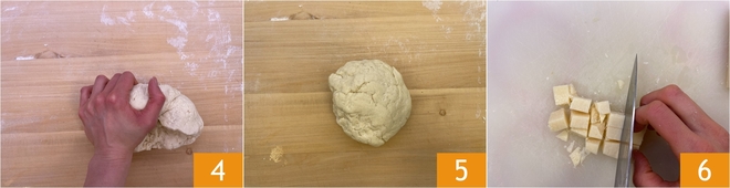 Continue trabalhando 4 até que a massa fique lisa e homogênea. Forme um bloco 5, envolva-o em filme plástico e deixe-o descansar por meia hora na geladeira, assim será mais fácil de trabalhar. Enquanto isso, dedique-se ao recheio: corte a caciotta em cubos 6.
