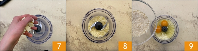 Processe-a no liquidificador 7 até obter uma consistência arenosa 8, depois adicione os ovos e o Parmigiano Reggiano ralado 9.