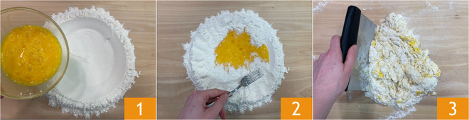 Para preparar os raviolis com ervas aromáticas na massa, como primeira coisa, coloque a farinha em uma superfície em formato de montinho e despeje os ovos batidos no centro 1. Com um garfo, incorpore aos poucos a farinha 2, depois continue com um raspador de massa 3.