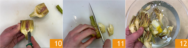 Limpe a base do cabo, depois divida as alcachofras ao meio e remova a parte interna 10. Finalmente, corte-as em fatias 11. À medida que as limpa, mergulhe-as em água acidulada 12.