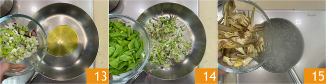 Em uma panela, aqueça um fio de óleo, adicione a cebolinha 13 e as ervilhas tortas 14. Cozinhe em fogo médio-alto por alguns minutos. Enquanto isso, escalde as alcachofras por 3-4 minutos 15.