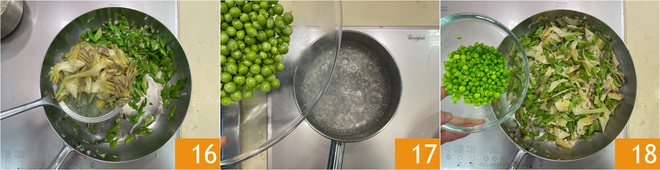 Adicione as alcachofras na panela 16. Na mesma água, escalde também as ervilhas 17 e adicione-as aos outros vegetais 18.