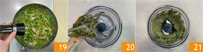 Acerte o sal e a pimenta 19 e cozinhe por mais 10 minutos. Transfira tudo para um processador 20 e bata até obter uma mistura cremosa e homogênea 21. Transfira o recheio para um saco de confeiteiro e reserve.