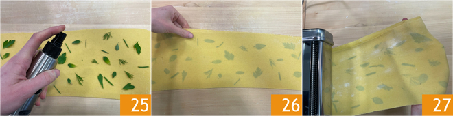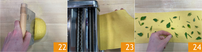 Após o tempo de descanso, pegue a massa e divida-a em 2 partes 22. Com uma máquina de macarrão, abra 2 folhas com espessura de cerca de 1,5 mm, começando do primeiro rolo até chegar ao último 23. Disponha na primeira folha os raminhos de ervas aromáticas 24.