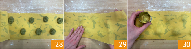 Em uma das folhas, esprema montinhos de recheio a uma distância de 3-4 cm um do outro 28, depois cubra com a outra folha 29. Utilize o lado oposto de um cortador de biscoitos de 4 cm de diâmetro para eliminar o ar com movimentos circulares 30.