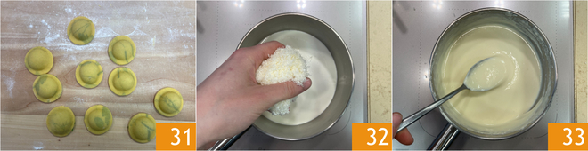 Faça os raviolis com o cortador de biscoitos 31 e reserve. Você obterá cerca de 20 raviolis. Cuide agora do molho de queijo: em uma panela pequena, despeje o creme de leite e o Parmesão 32, depois derreta em fogo bem baixo, mexendo continuamente com uma colher 33 ou um batedor, por 5 minutos.