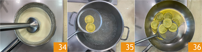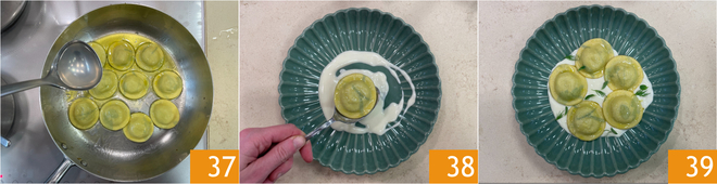 Quando o queijo estiver derretido, bata por alguns segundos com um mixer de imersão para obter uma mistura lisa e cremosa 34. Cozinhe os raviolis em água fervente salgada por cerca de 3 minutos 35. Escorra os raviolis diretamente em uma panela com um fio de óleo 36.