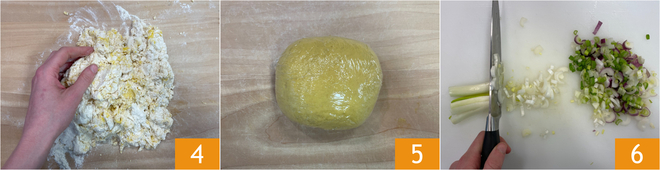Amasse então com as mãos 4 até obter uma massa lisa e homogênea. Envolva em filme plástico 5 e deixe descansar na geladeira por 20 minutos. Dedique-se agora à preparação do recheio: limpe e corte finamente as cebolinhas 6.