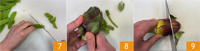 Corte as ervilhas tortas em losangos 7 e descasque as ervilhas frescas. Passe para a Como limpar alcachofras: elimine as folhas externas mais duras 8, depois retire as pontas com um corte reto 9.