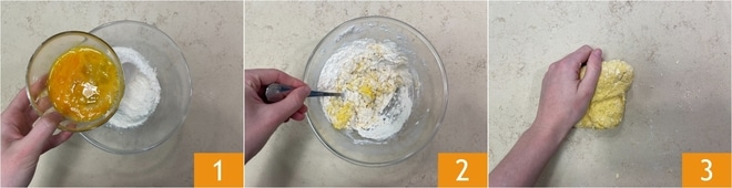 Para preparar os raviolis recheados de camarões, stracciatella e grelos, comece pela massa fresca: em uma tigela coloque a farinha e os ovos 1, misture primeiro com o garfo 2 e depois com as mãos, transferindo para a superfície de trabalho 3.