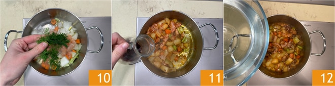 Perfume com um maço de endro 10, flambe com o conhaque 11 e flambe (esta operação não é indispensável, se não se sentir confiante com este tipo de operação pode evitar e esperar que a parte alcoólica evapore: levará poucos minutos). Depois, cubra com água fria 12 e cozinhe por 30 minutos.