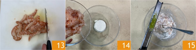 Pique os camarões com uma faca 13, coloque-os em uma tigela com a ricota 14, misture e tempere com sal e raspas de limão 15.