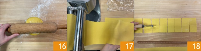 Retire a massa fresca e achate-a com o rolo após dividi-la em pedaços menores 16, trabalhe um pedaço por vez mantendo os outros cobertos com filme plástico, assim não secarão. Estenda a massa com a máquina de macarrão até atingir uma espessura de cerca de 3 mm 17, corte retângulos longos, recorte quadrados de cerca de 5 cm 18.