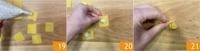 Recheie com o recheio de camarão e ricota ajudando-se com o saco de confeitar 19. Agora feche a massa criando saquinhos: levante os cantos opostos 20 e faça-os aderir 2122.