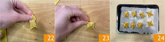Pressione bem com os dedos a massa para formar o saquinho 23. Transfira os raviolis para uma bandeja forrada com papel manteiga enfarinhado 24.