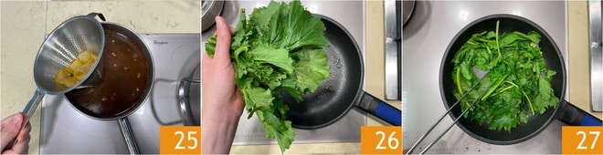 Coe o caldo e reserve uma concha para os grelos 25. Deixe o resto do caldo reduzir no fogo até criar um molho denso e concentrado (levará pelo menos 30 minutos). Cozinhe os grelos na panela com azeite, alho e sal fino 26 até murcharem 27.