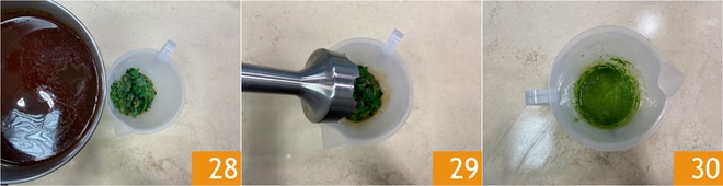 Adicione metade dos grelos ao caldo de crustáceos reservado 28 e um fio de azeite, bata com o mixer de mão 29 até obter um molho 30.