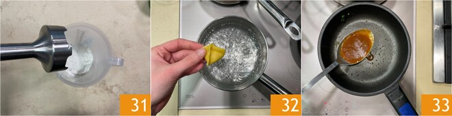 Bata também a stracciatella 31 para obter um molho liso. Cozinhe os saquinhos em água fervente com sal até subirem à superfície 32. Enquanto isso, despeje a redução do caldo de peixe na panela 33.