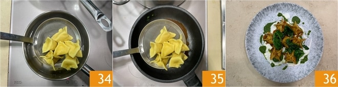 Escorra os raviolis 34 na panela com a redução do caldo 35 e deixe-os apurar por um instante. Sirva os raviolis: distribua no prato a stracciatella, o molho de grelos, depois coloque os raviolis por cima e decore com os grelos inteiros reservados 36.
