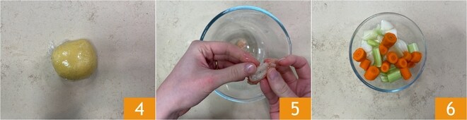Trabalhe por cerca de 10 minutos com energia, então forme uma bola, embrulhe com filme plástico 4 e deixe descansar na geladeira por 30 minutos. Limpe os camarões guardando tanto a cabeça quanto a casca (servirão para o caldo de crustáceos!) 5, descasque e corte em pedaços cebola, cenoura e aipo 6.
