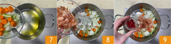 Doure os vegetais em uma panela com um fio de azeite 7, adicione as cascas e cabeças dos camarões 8 e o extrato de tomate 9.