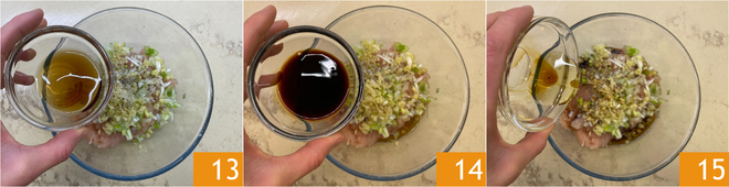 Adicione também o vinho de arroz 13, o molho de soja 14 e o óleo de gergelim 15.