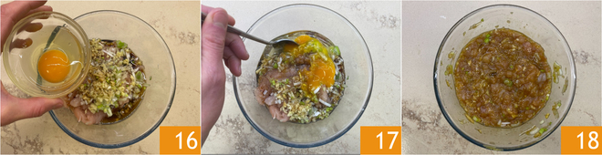 Por fim, adicione o ovo 16 e misture bem tudo com as mãos ou com um garfo 17. Deixe descansar na geladeira por 30 minutos 18, coberto com filme plástico.