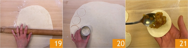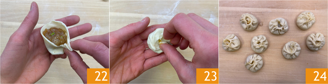 Dobre o disco e faça pequenas dobras começando por uma extremidade, enquanto com a outra mão leve as bordas da massa para o centro e empurre o recheio para baixo 22. Finalmente, frise o fechamento para selar o recheio dentro 23 e obter uma forma arredondada 24.