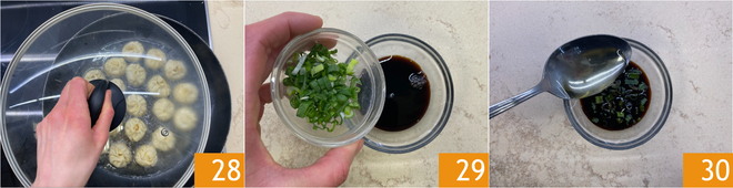 Feche com a tampa 28 e cozinhe por 10-15 minutos. Enquanto isso, prepare o molho de acompanhamento: em uma tigelinha, misture o molho de soja, a parte verde da cebolinha 29 e um pouco de vinagre de arroz 30.