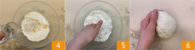 Adicione gradualmente a água morna 4 enquanto mistura com a mão para incorporá-la 5, depois transfira a mistura para a superfície de trabalho e continue amassando até obter uma massa compacta, lisa e homogênea 6; se necessário, pode adicionar mais um pouco de água. Coloque a massa de volta na tigela, cubra com um pano e deixe descansar à temperatura ambiente por 30 minutos.