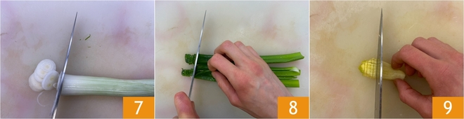 Enquanto isso, prepare o recheio. Separe a parte branca da parte verde da cebolinha: fatie finamente a primeira 7 e pique a segunda 8. Descasque o gengibre e corte-o em cubinhos pequenos 9.