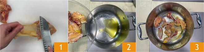 Para preparar os raviolis de frango, comece pelo caldo: retire a pele 1 e também os ossos do frango, reservando a carne. Em uma panela grande, adicione um fio de óleo e em fogo bem alto, doure os ossos 2 por alguns minutos 3.