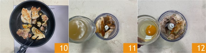 Cozinhe bem de ambos os lados por cerca de 10 minutos 10. Quando o frango estiver cozido, coloque-o em um mixer e adicione 90 g do caldo preparado anteriormente 11, sal, pimenta, manjerona e o ovo 12.