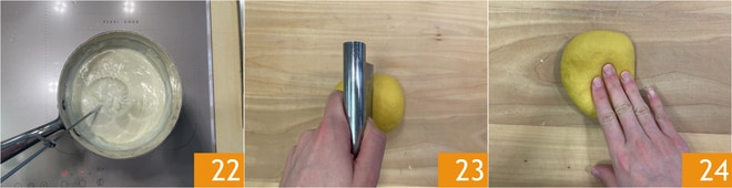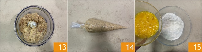 Bata a mistura 13, depois transfira para um saco de confeitar 14 e mantenha na geladeira. Enquanto isso, prepare a massa fresca: em uma tigela, coloque a farinha e os ovos batidos 15.
