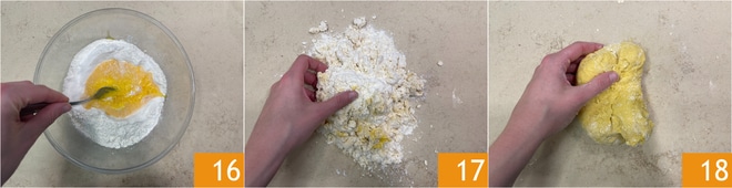 Reúna os ingredientes com um garfo e então continue amassando com as mãos 17 até obter uma massa 18, trabalhe-a até ficar lisa, levará cerca de 15 minutos. Cubra com filme plástico e deixe a massa descansar em um local fresco e seco.