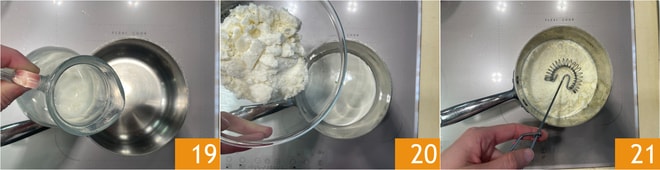 Prepare o molho de pecorino: coloque o creme de leite em uma panelinha 19, adicione o pecorino ralado 20, derreta em fogo bem baixo por alguns minutos, mexendo com um batedor 21.