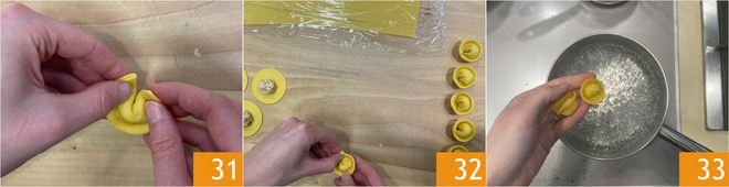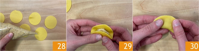 Pressione com um dedo a parte central, depois junte as duas extremidades externas para fechar o ravioli em si mesmo 31. Pressione bem a massa para selá-la e coloque os raviolis em uma bandeja 32. Cozinhe os raviolis em água fervente e salgada até que subam à superfície 33.