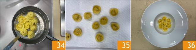 Escorra os raviolis 34 em uma bandeja com papel absorvente 35 e coloque-os no prato, dispondo-os de forma circular 36.