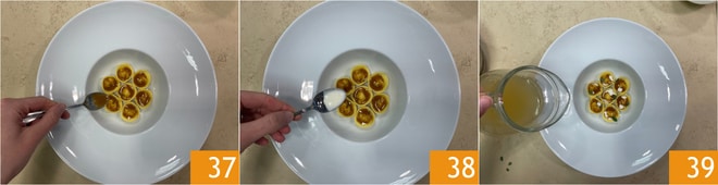 Em cada ravioli, adicione o fundo de frango 37, um pouco de molho de pecorino e finalize com um pouco de caldo morno no prato e algumas folhas de manjerona fresca. Os raviolis de frango estão prontos para serem servidos 39.