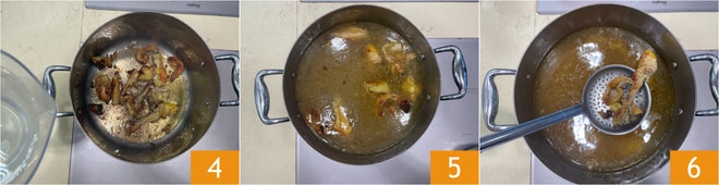 Quando estiverem escuros e dourados 4, adicione 4 litros de água fria e cozinhe em fogo bem baixo por 2 horas 5. Retire os ossos e coe o caldo 6.