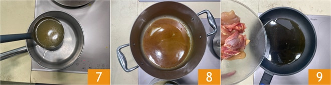Reserve algumas conchas em uma panelinha 7, o restante coloque de volta na panela e em fogo alto deixe reduzir até que se torne um molho espesso e escuro 8, assim estará pronto o fundo de frango. Em uma frigideira antiaderente, doure a carne do frango com um fio de óleo 9.