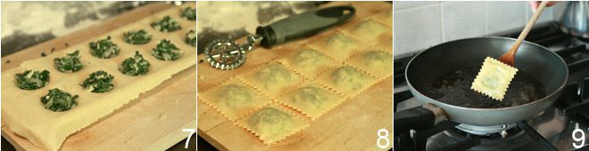 Abra a massa com a ajuda do rolo ou da máquina de macarrão até a espessura mais fina. Coloque na massa obtida montinhos de recheio 7 e corte os raviolis usando a roda apropriada 8 e disponha-os sobre uma superfície enfarinhada. Cozinhe os raviolis em bastante água salgada. Escorra-os, coloque-os em uma panela com um pouco de manteiga derretida 9 e mexa com cuidado para dar brilho. Sirva os raviolis quentes sobre uma "cama" de creme de batatas.