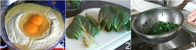 Coloque a farinha em forma de montinho; faça um buraco no centro e quebre os ovos 1. Adicione uma pitada de sal e amasse até obter uma massa lisa e elástica. Cubra com filme plástico e deixe descansar na geladeira por pelo menos 30 minutos. Para preparar o recheio, limpe cuidadosamente as folhas das acelgas. Descarte a parte central de cada folha, que é mais dura 2, e corte o restante em tirinhas. Ferva as acelgas em água levemente salgada por 5 minutos ou até que fiquem macias. Escorra e esprema bem 3.