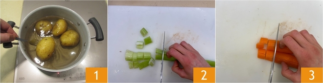 Para preparar os raviolis de peixe com três massas, primeiro cozinhe as batatas em água fervente por cerca de 30 minutos após ferver, até ficarem macias 1. Enquanto isso, prepare os legumes que vão cozinhar com o polvo: limpe e corte o aipo em pedaços 2 e a cenoura 3.