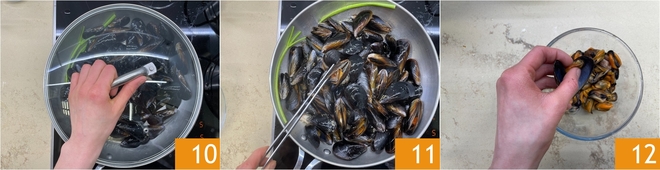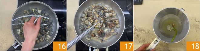 Cubra com a tampa 16 e cozinhe por cerca de 5 minutos, até que se abram 17. Descasque as amêijoas, coe a sua água de cozimento 18 e guarde na geladeira.