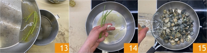 Coe o líquido de cozimento e reserve 13. Agora cozinhe as amêijoas da mesma forma: aqueça o alho e as hastes de salsa na panela 14, depois adicione as amêijoas e a água 15.
