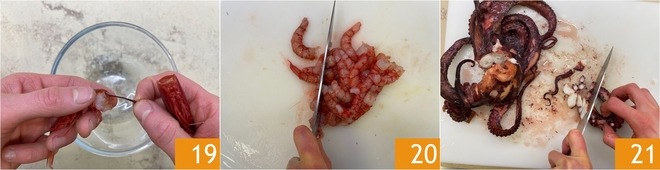 Limpe os camarões vermelhos: retire a cabeça e a carapaça, depois extraia o intestino 19. Pique os camarões para reduzi-los a uma tartare 20. Retome o polvo cozido e também coe sua água, junte-a com a dos mexilhões e amêijoas para criar um fundo de cozimento. Retire a cabeça do polvo e pique grosseiramente os tentáculos 21.