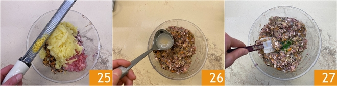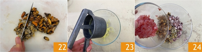 Tempere com as raspas de limão 25, um fio de azeite e as folhas de salsa picadas. Misture para incorporar, depois ajuste a consistência da mistura adicionando uma concha de água de cozimento de polvo, mexilhões e amêijoas 26. Transfira o recheio para um saco de confeitar sem bico e guarde na geladeira.